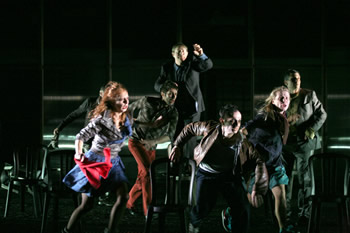 Ionesco writes for what seems to me an essentially adolescent sensibility. Each of his plays introduces one central absurdity—proliferating chairs, proliferating rhinoceroses, a teacher who kills his students, a tenant who crams his apartment with furniture—and then worries it to death with cyclical repetition. There is never really surprise after the first absurd tingle, only the tedium of watching an ineluctable accumulation or depletion process work itself out. You need to be thirteen years old for such matters to sustain you for two hours. To my mind, then, the best Ionesco productions are those that supplement his texts with theatrical business that supplies the missing surprise and suspense. This is the strength of Emmanuel Demarcy-Mota’s version of Rhinoceros, now visiting BAM from the Théâtre de la Ville in Paris. Demarcy-Mota replaces the quasi-realistic café location of the first scene, for instance, with a vaguely defined open space filled with plastic chairs and backed with an ambiguous architectural frame. Here the cast of thirteen mills about, masses like an expressionist chorus, and moves in fascinating choreographed unison when the first rhinoceros is heard bellowing. Later the government office scene becomes a hilariously chaotic spectacle of gymnastic tumbling as the space (designed by Yves Collet) rises on two sides like a pair of diabolical drawbridges when the beasts begin to attack the place. These are just the sort of physical tricks that are needed to pull the attention through the longueurs of protagonist Berenger’s haplessly sentimental monologues. Even the fine actor who plays him, Serge Maggiani, seems to agree, evidently buoyed by the support of the physical shenanigans swirling round him.